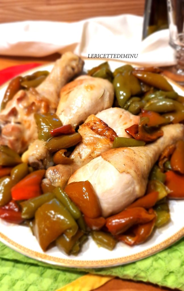 Die Hähnchenschenkel, die nach diesem Rezept zubereitet werden, sind sehr zart, die Paprika eine köstliche Beilage mit einer leckeren Sauce, ideal zum Aufsaugen mit einem Stück knusprigem Brot.