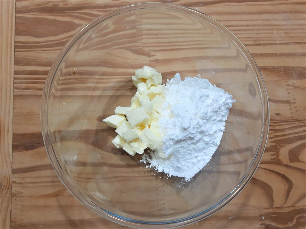 Per die Harlekin-Kekse mit bunten Schokoladenkonfetti vorzubereiten, arbeiten Sie in einer Schüssel mit den elektrischen Schneebesen die in Stücke geschnittene (und sehr weiche) Butter mit dem Puderzucker und Vanillin.