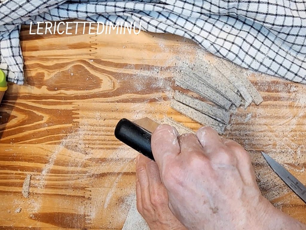 • Nachdem Sie 3 lange Streifen der angegebenen Breite erhalten haben, diese leicht mit Mehl bestäuben und mit einem Teigschneider viele Streifen mit einer Länge von 7 cm und einer Breite von 0,5 cm schneiden.