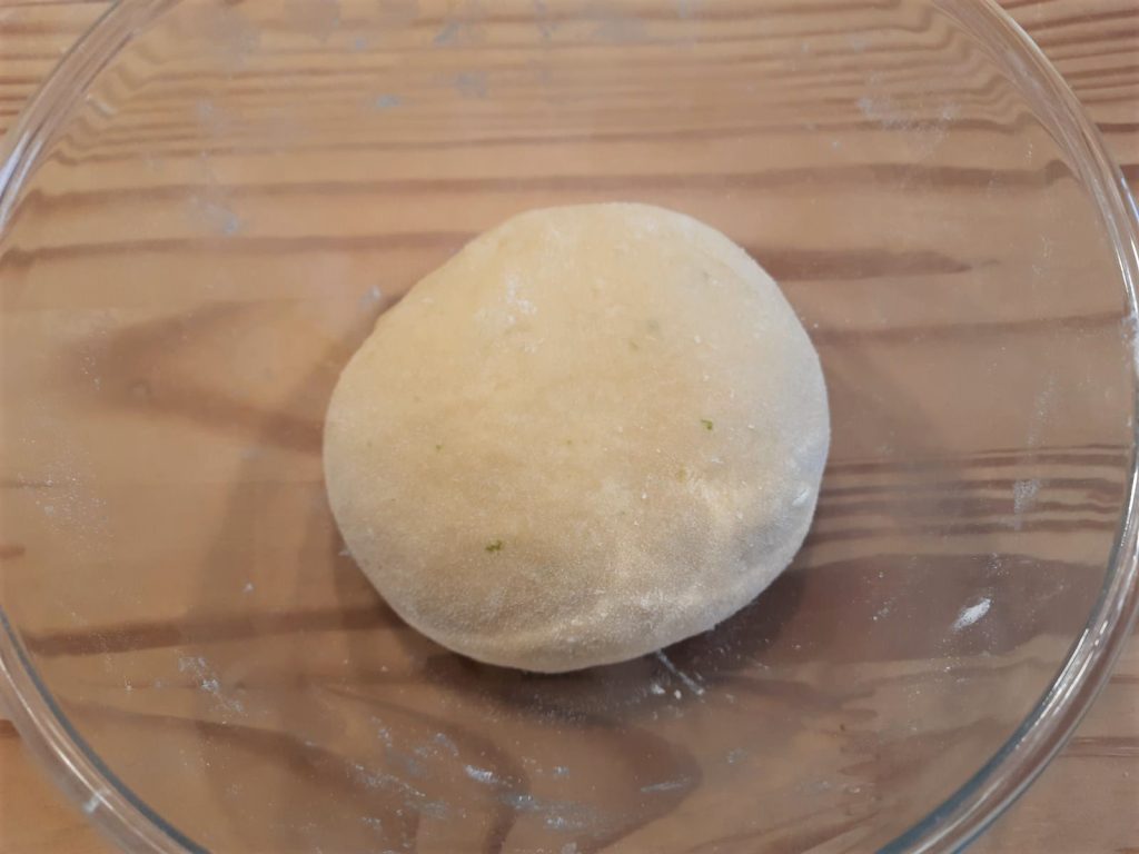Einen festen, homogenen Teigballen formen, leicht mit Mehl bestäuben und etwa eine halbe Stunde lang abgedeckt bei Raumtemperatur ruhen lassen.