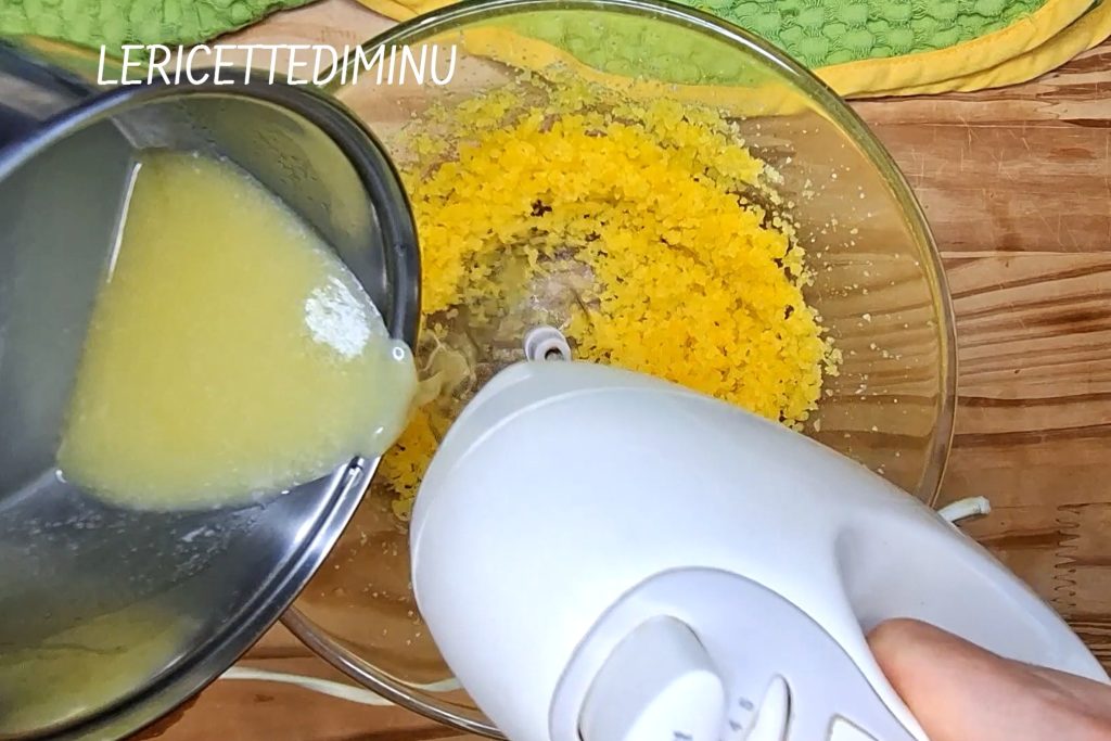 Die geschmolzene Butter langsam hinzufügen, während die Eigelbmischung mit dem Mixer bearbeitet wird.
