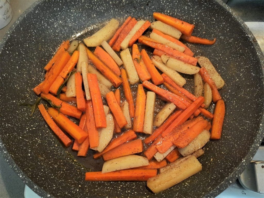 Die glasierten Karotten und Kartoffeln in der Pfanne sind nun fertig.