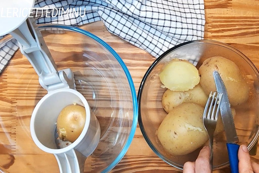 Es ist nicht nötig, sie zu schälen, sondern schneiden Sie sie einfach in zwei Hälften und geben Sie sie mit der Schnittseite nach unten in die Kartoffelpresse. Die Schale bleibt in der Presse, und dann entfernen Sie sie, bevor Sie zur nächsten übergehen.