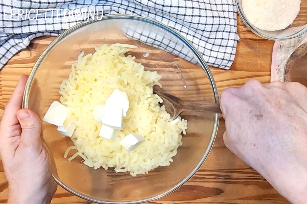 Zu den zerdrückten Kartoffeln die in Stücke geschnittene Butter hinzufügen und umrühren, dann die heiße Milch und schließlich den geriebenen Parmesan.