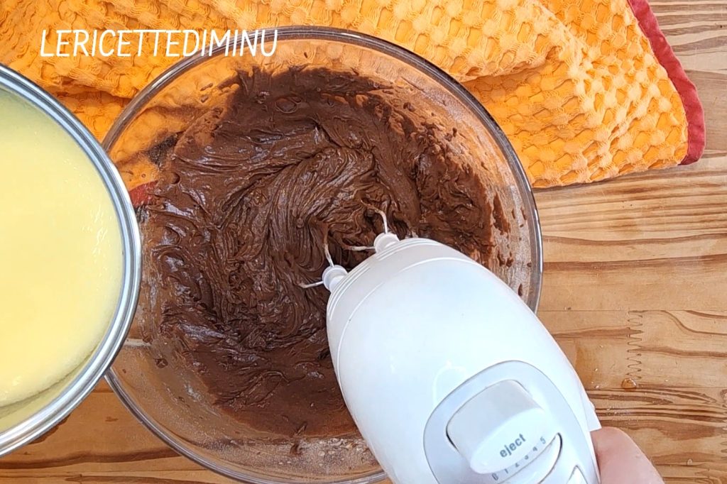 Zum Ei-Mix nach und nach das Mehl, den Kakao und das Backpulver hinzufügen.