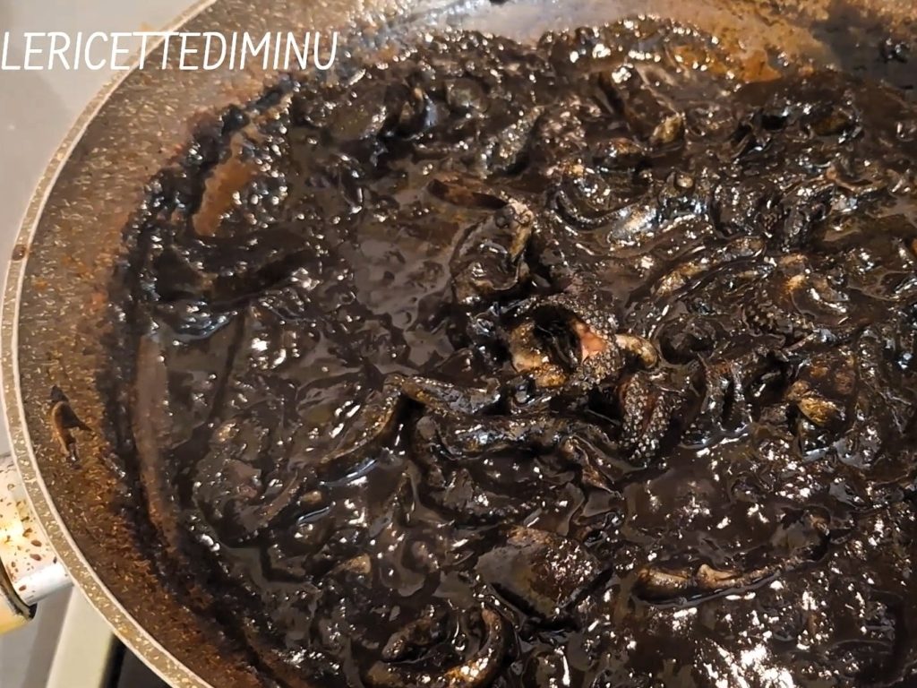 Zu diesem Zeitpunkt die Hände mit lebensmittelechten Handschuhen schützen und die Beutel mit der Tinte der Tintenfische direkt über dem Inhalt der Pfanne einschneiden.Auf diese Weise fällt die ganze Tinte in die Sauce und wird nicht verschwendet.