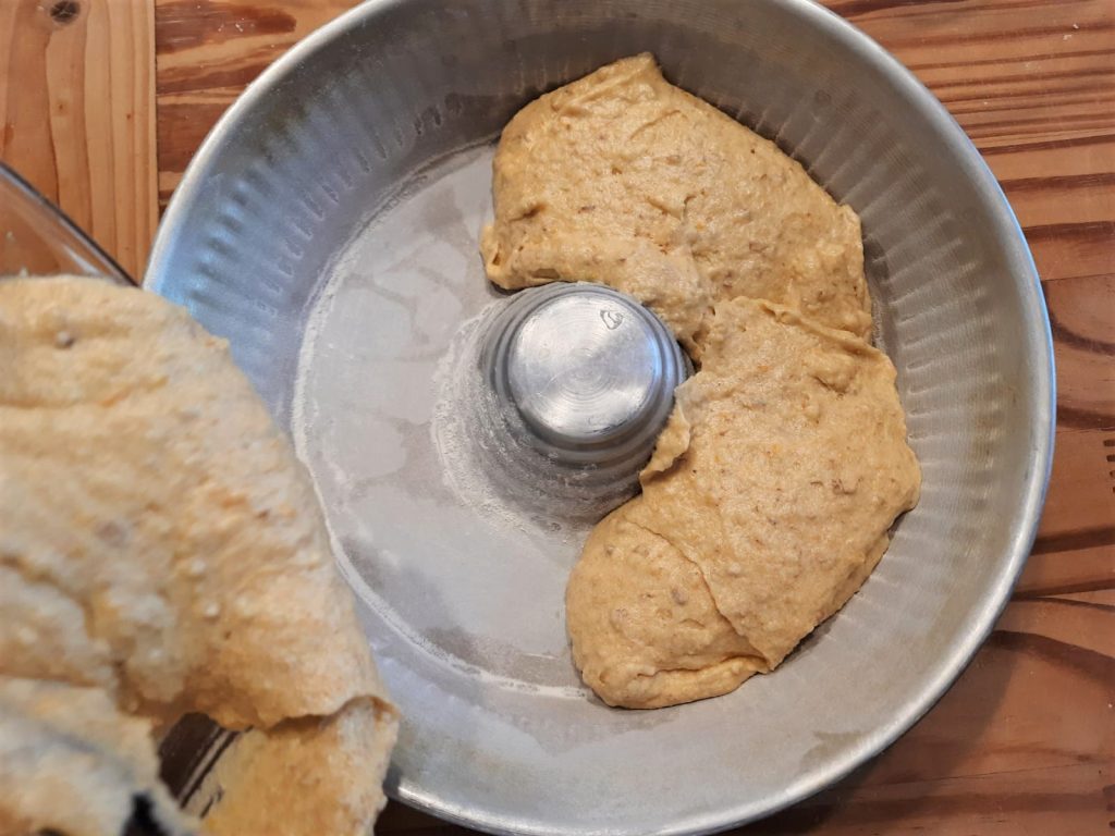 Gießen Sie den Teig in eine gut gebutterte und bemehlte Springform für Kranzkuchen mit 24 cm Durchmesser.