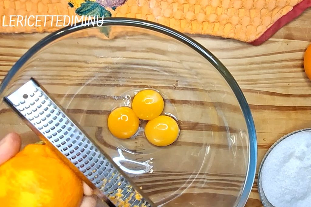 • Dann, ebenfalls mit den elektrischen Schneebesen, die Eigelbe mit der abgeriebenen Schale einer ungespritzten Orange und dem Zucker verarbeiten.