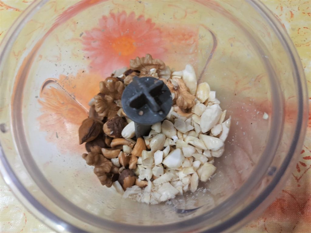 Per bereiten Sie den einfachen Pan di Stelle Kuchen ohne Backen, beginnen Sie damit, das Trockenobst grob im Mixer zu hacken. Dies kann eine Mischung sein, wie bei mir, oder nur eine Sorte davon, wie zum Beispiel Haselnüsse.