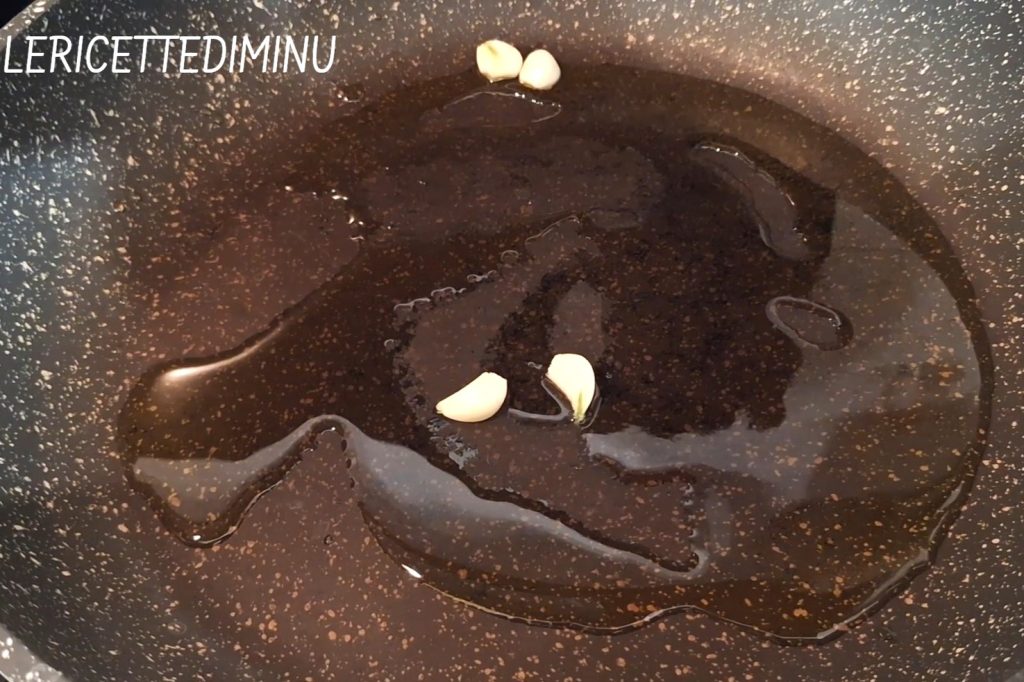 Eine Pfanne mit Olivenöl und 2 gehackten oder zerdrückten Knoblauchzehen auf den Herd stellen.