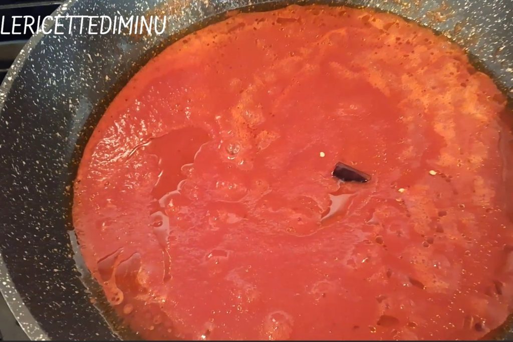 Fügen Sie in der Pfanne die Tomatenpassata, Wasser in gleicher Menge wie die Passata und ein Stück nach Belieben scharfen roten Chili hinzu.