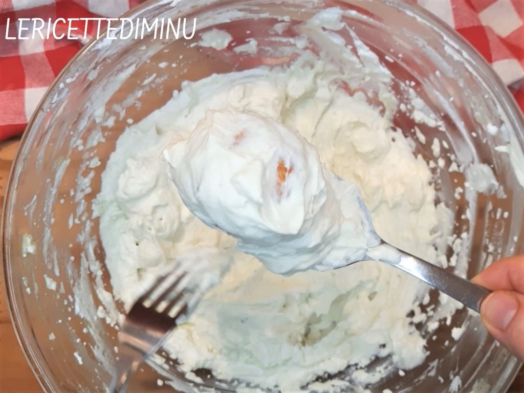 Nach Abschluss dieser Operation die restliche geschlagene Sahne, die wir in den Kühlschrank gestellt hatten, zur übrig gebliebenen Creme von der Füllung hinzufügen.