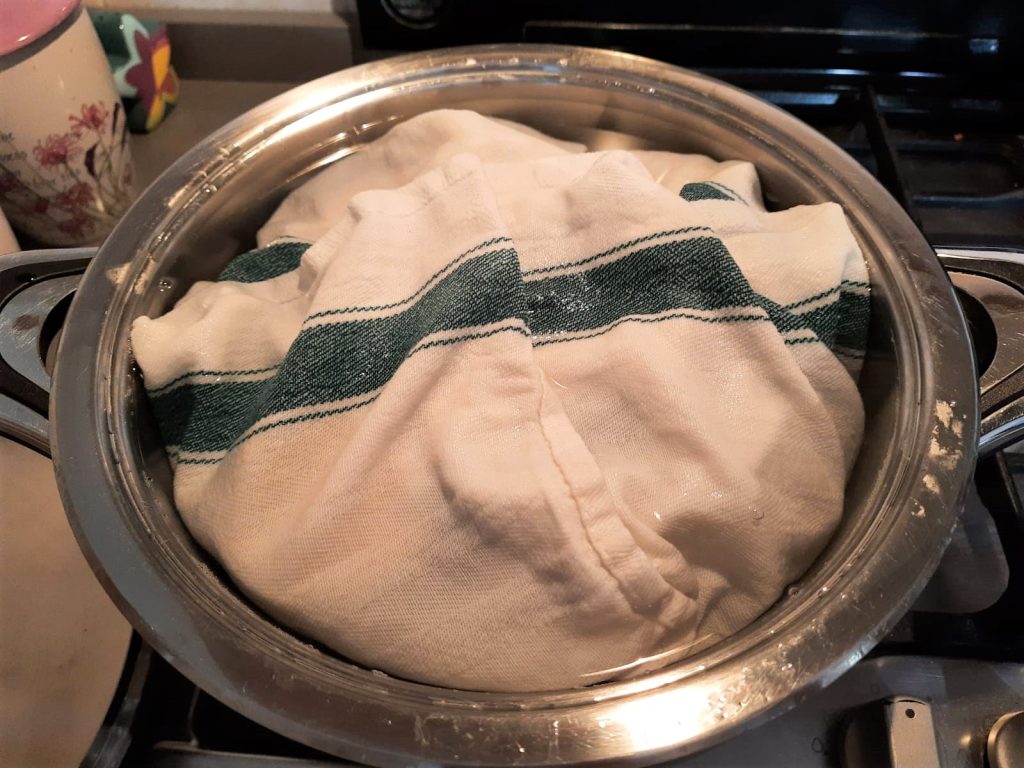Überstehende Enden der verwendeten Tücher über die Gläser klappen und den Topf mit seinem Deckel schließen. Etwa eine halbe Stunde lang kochen lassen.