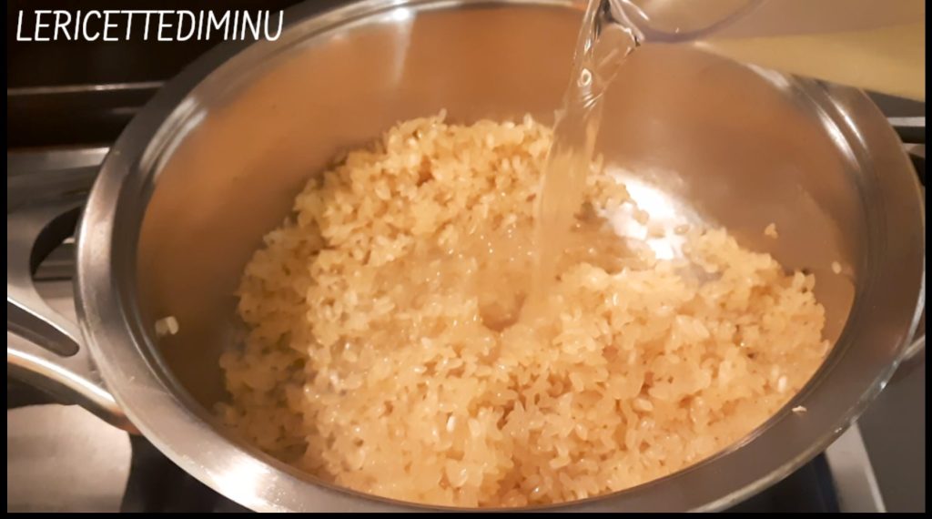 Brühe hinzufügen, um den Reis zu bedecken, und wenn es kocht, salzen.