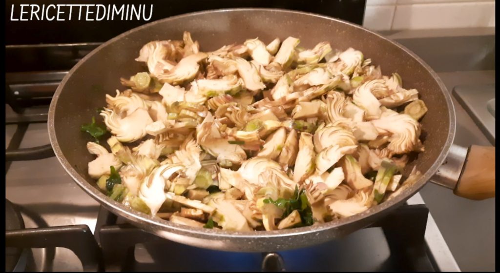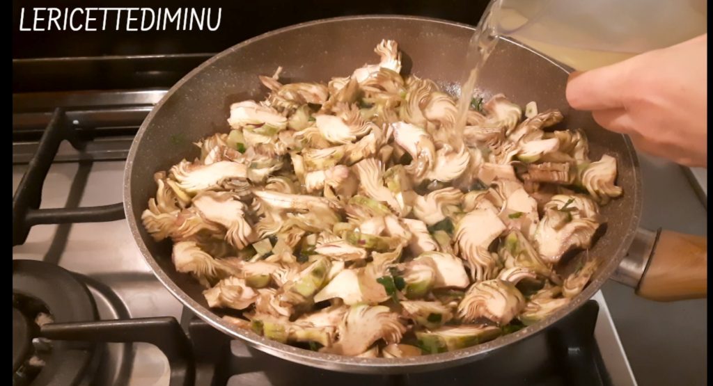 Die in Scheiben geschnittenen Artischocken und ihre in dünne Scheiben geschnittenen Stängel hinzufügen.