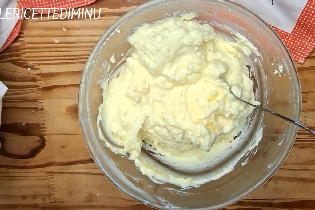 An diesem Punkt die Creme wieder aufnehmen und sie kurz mit den elektrischen Schneebesen bearbeiten. Fügen Sie zwei oder drei Esslöffel Schlagsahne hinzu und vermengen Sie sie mit Hilfe der Schneebesen.