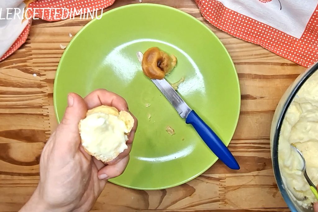 Mit der so erhaltenen Creme die Windbeutel füllen. Dies kann man tun, indem man den Spritzbeutel mit einer glatten Tülle versieht und die Unterseite des Windbeutels durchbohrt, oder wie ich es mache, indem man ihn halbiert und mit einem Teelöffel füllt.