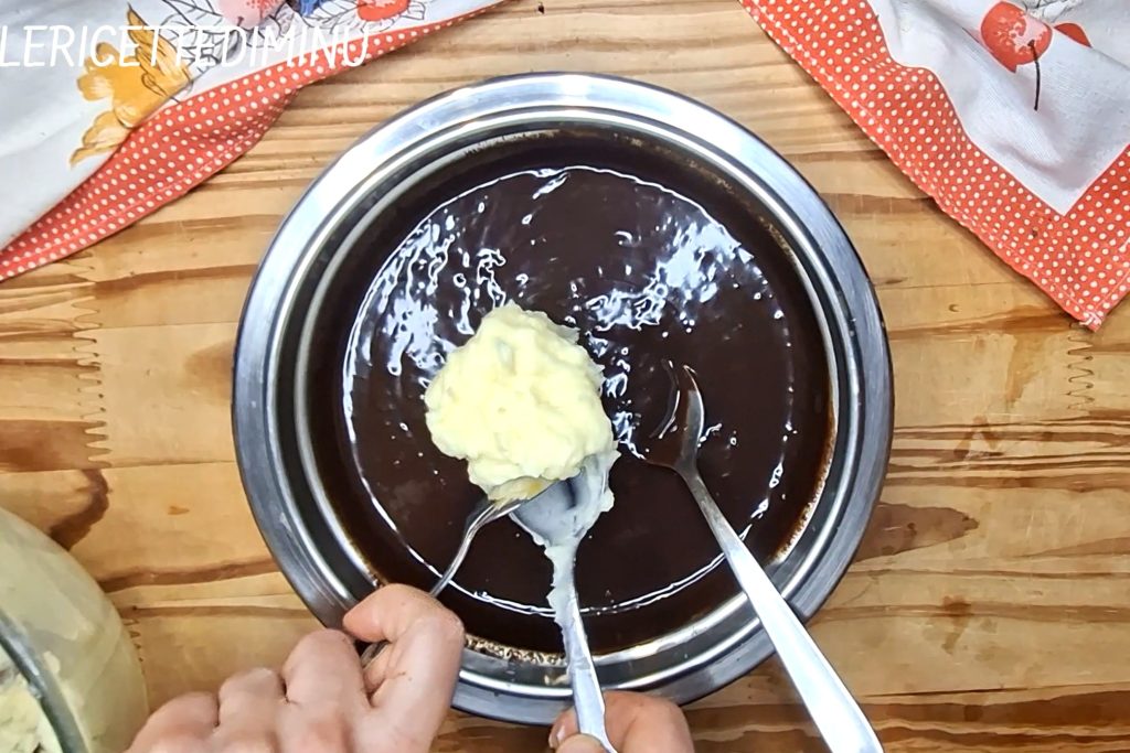 Wenn sie geschmolzen ist, einen Esslöffel der für die Füllung verwendeten Creme hinzufügen und vermengen, bis sie gut integriert ist.