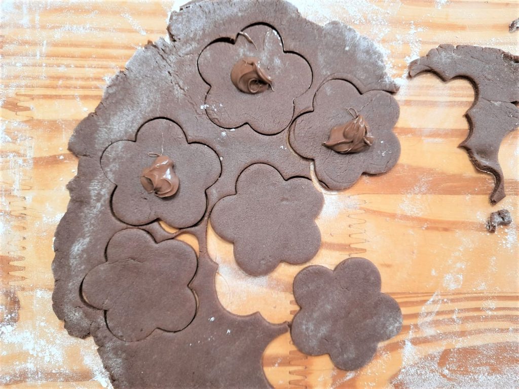Den Keks mit Nutella mit einem anderen Blütenkeks bedecken und vor allem rund um die Füllung gut mit den Fingern verschließen.