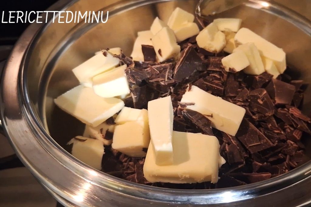 Die Schokolade in Stücke schneiden und im Wasserbad zusammen mit der Butter schmelzen.