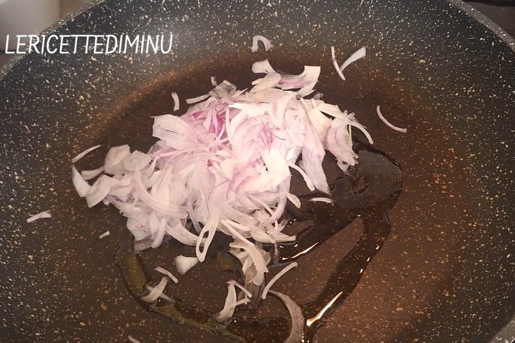In einer großen Pfanne, vorzugsweise antihaftbeschichtet, die Zwiebel in nativem Olivenöl anbraten, bis sie weich wird.Falls gewünscht, etwas Wasser hinzufügen und die Zwiebel sanft im abgedeckten Topf dünsten.