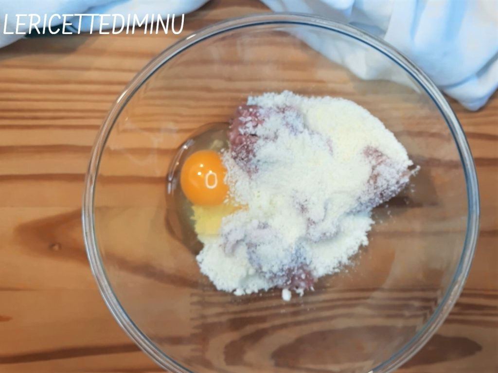 Separat das Kalbsgehackte, die vom Darm befreite Schweinswurst, den geriebenen Pecorino (oder eine Mischung aus Pecorino und Parmesan), die leicht mit wenig Wasser angefeuchteten Semmelbrösel, Salz und frisch gemahlenen schwarzen Pfeffer miteinander vermengen.