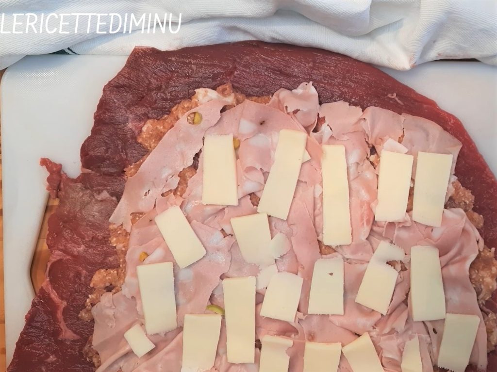 Auf die Schicht aus Hackfleisch die in Stücke gebrochene Mortadella ohne die harte Umrandung, den geschnittenen Caciocavallo legen und in der Mitte, nacheinander die hartgekochten Eier, die zuvor geschält wurden.