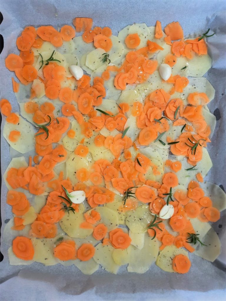 Um die Aiole im Ofen mit Kartoffeln und Karotten zuzubereiten, die 4 Kartoffeln von etwa (150 g je) und 3 mittelgroße Karotten fein mit der Mandoline schneiden, gleichmäßig auf das auf dem Backblech ausgelegte Backpapier legen, zwei halbierte Knoblauchzehen hinzufügen.