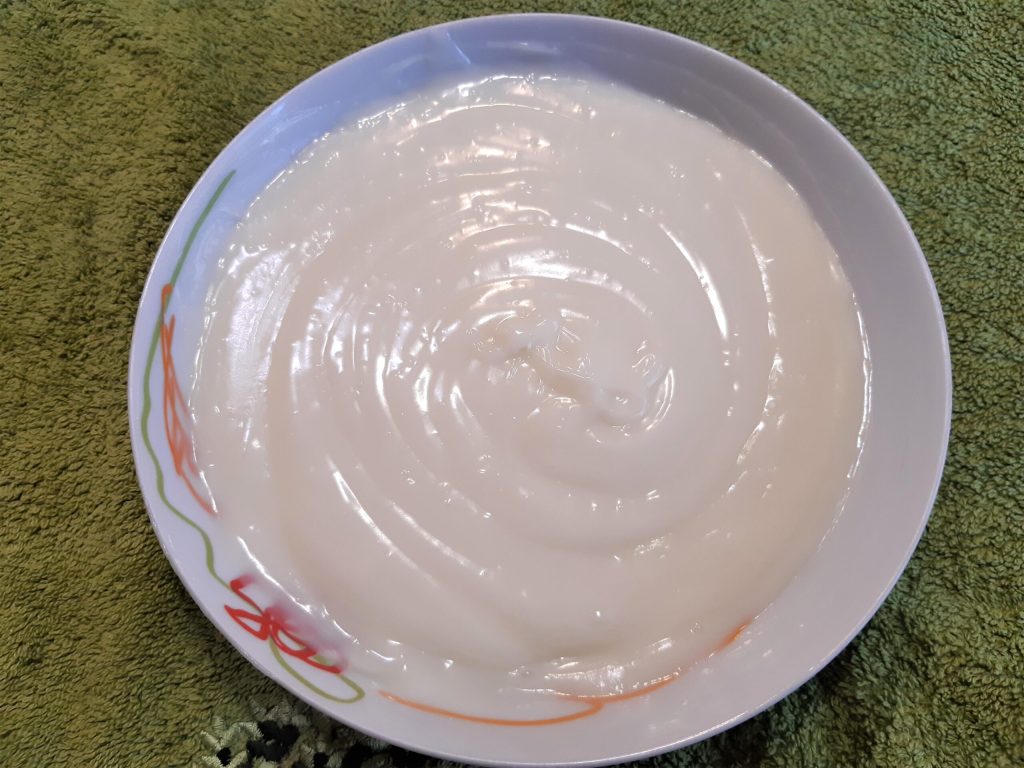 Dann ausschalten, die Creme auf einen Teller geben und mit einer Folie direkt auf der Oberfläche abdecken und abkühlen lassen.
