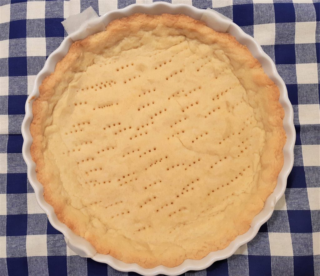 Nach dieser Zeit die Mürbeteigboden aus dem Ofen nehmen, das Papier mit den Bohnen entfernen und einige Minuten weiterbacken, bis der zuvor bedeckte Boden durchgebacken ist, ohne Farbe anzunehmen.