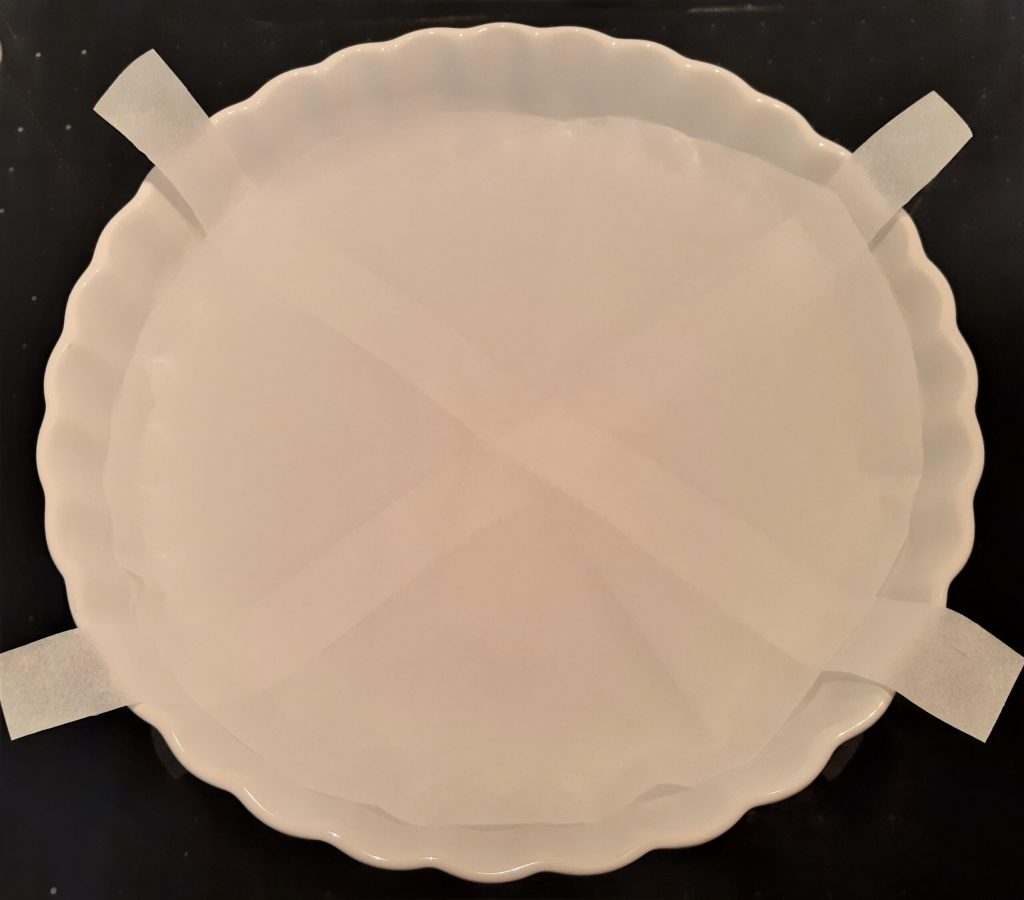 – zwei Streifen Backpapier in Form eines X darauf auslegen, die jeweils etwa 3 cm breit und ausreichend lang sind;