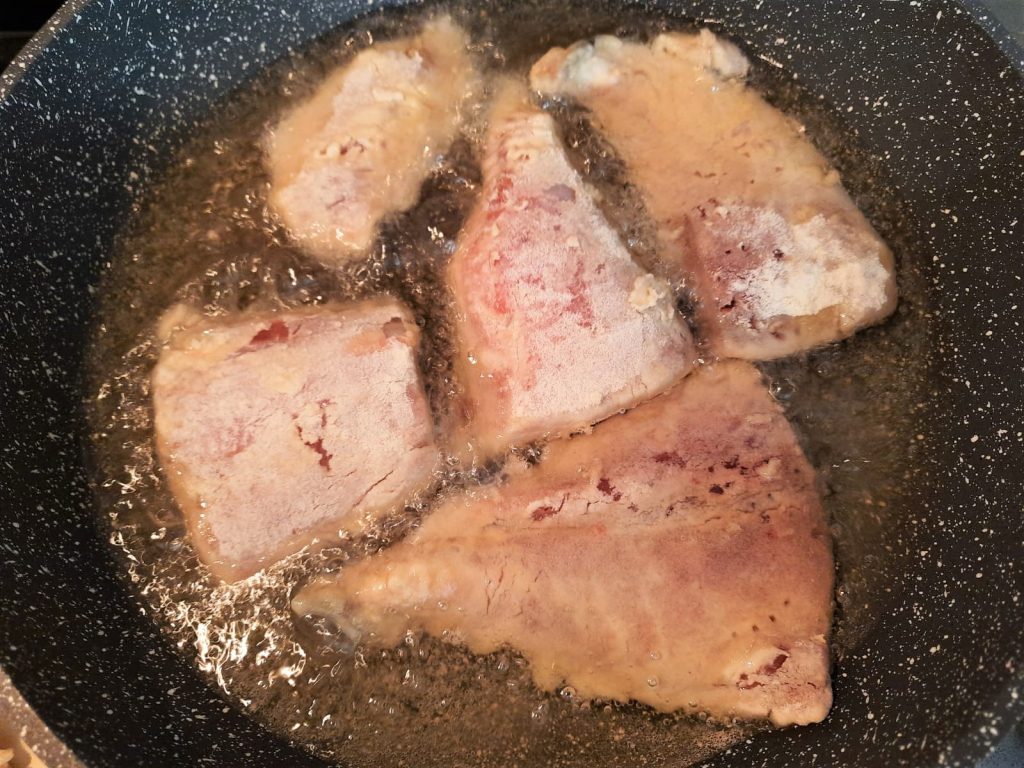 In der Zwischenzeit eine beschichtete Pfanne mit reichlich Pflanzenöl erhitzen. Wenn es heiß genug ist (wenn man den Holzlöffelstiel in das Öl taucht, bilden sich kleine Bläschen), die Thunfischstücke frittieren, zur Hälfte der Garzeit wenden.