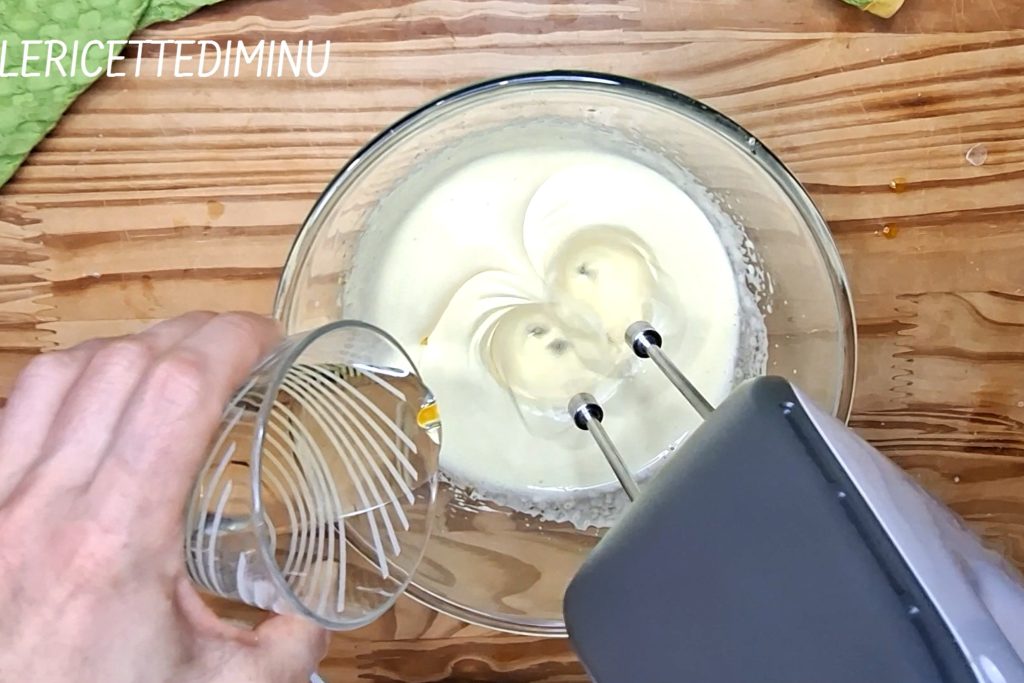 Weiterschlagen, bis die Masse schön schaumig und luftig ist. Dann das Öl langsam einlaufen lassen und dabei weiter schlagen, anschließend die Milch auf die gleiche Weise einarbeiten.