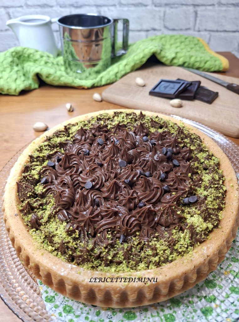 Zur eleganteren Präsentation kann man eine Dekoration wie ein leichtes Bestäuben mit Pistazienpulver hinzufügen – der Kontrast zwischen dem Grün der Pistazien und dem Braun der Schokolade macht die Crostata noch einladender.