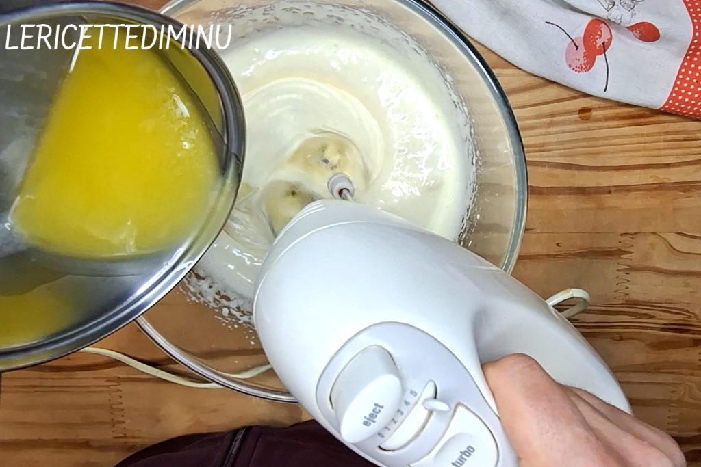 Die Eier mit dem Zucker und dem Vanillin mit den elektrischen Schneebesen arbeiten, bis sie schaumig werden.