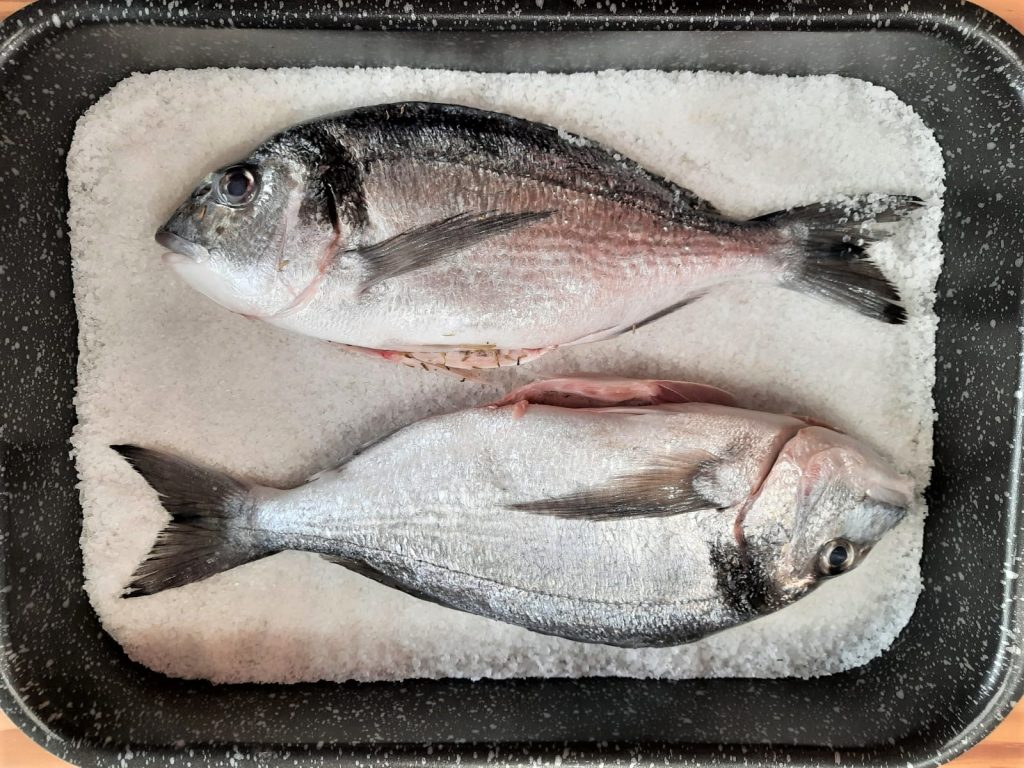 Per die Zubereitung des Wolfsbarschs (2 Stück à ca. 500 g) in grobem Salz, die Fische unter fließendem Wasser waschen, die nur ausgenommen wurden.