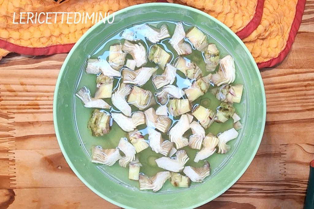Sobald das Öl zu braten beginnt, die Artischockenscheiben hinzufügen.