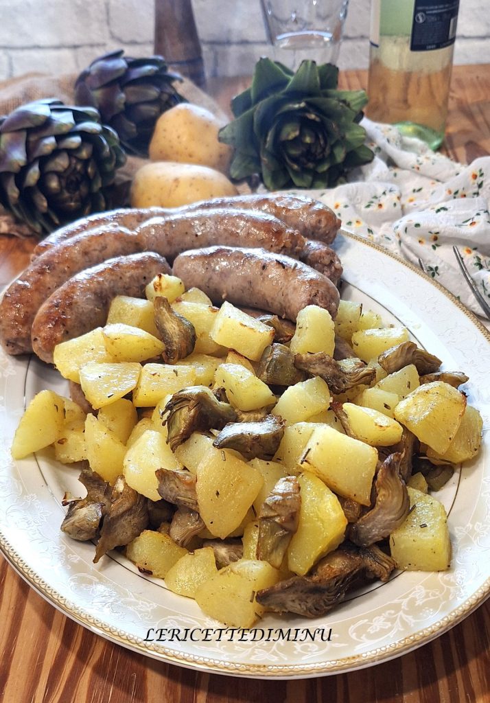 Die Wurst aus dem Ofen mit Kartoffeln und Artischocken ist nun fertig.