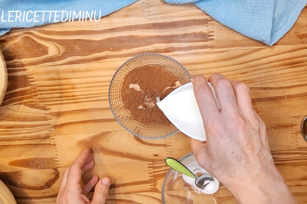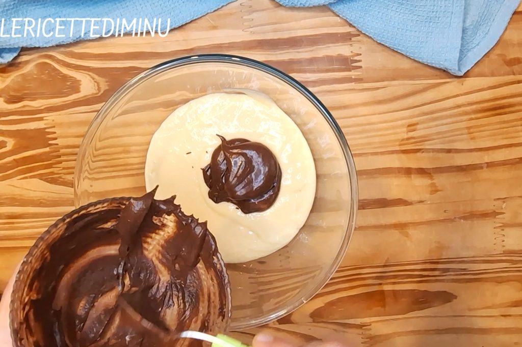 In eine der beiden Schüsseln den separat bearbeiteten Kakao mit 1 Teelöffel Zucker und so viel Milch, dass eine ähnliche Dichte wie der Teig entsteht, hinzufügen.