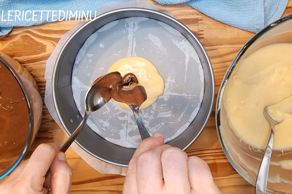 In die Mitte dieses Teigs zwei Löffel des dunklen Teigs fallen lassen und so fortfahren, die beiden Mischungen abwechselnd, bis sie aufgebraucht sind.