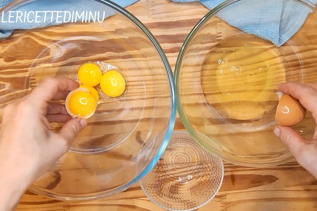 Die Eiweiße von den Eigelben trennen und diese in zwei separate Schüsseln geben.