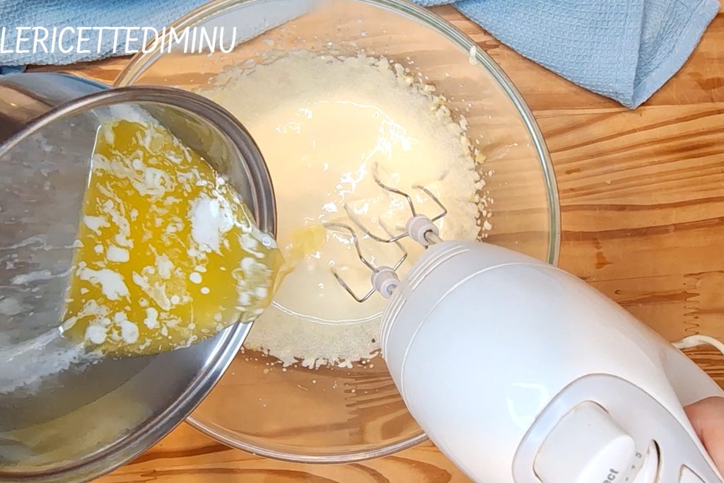 Wenn sie schaumig sind, die Vanillin und die geschmolzene, abgekühlte Butter hinzufügen.