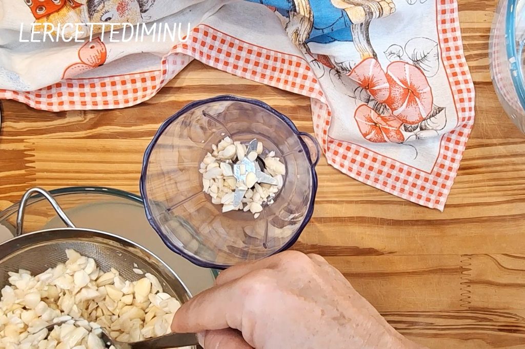 Sobald das Wasser abgelassen ist, das natürlich die Milch sein wird und deshalb in der Schüssel bleiben muss, die Mandeln pürieren und dann wieder in das gleiche Einweichwasser geben.