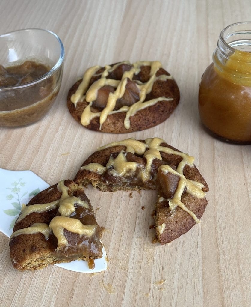 Das Endergebnis sind köstliche Apple Pie Cookies, die bereit sind, genossen zu werden! Jetzt können Sie Spaß daran haben, sie mit dem Salzkaramell zu dekorieren. Ich habe, wie auf dem Foto am Anfang des Rezepts gezeigt, einfach überkreuzte Linien auf dem Keks gezogen, indem ich ein in Karamell getauchtes Messer benutzt habe, aber Sie können Ihrer Fantasie freien Lauf lassen. Wenn Sie es vorziehen, können Sie das Karamell auch weglassen: Die Cookies werden trotzdem köstlich sein.