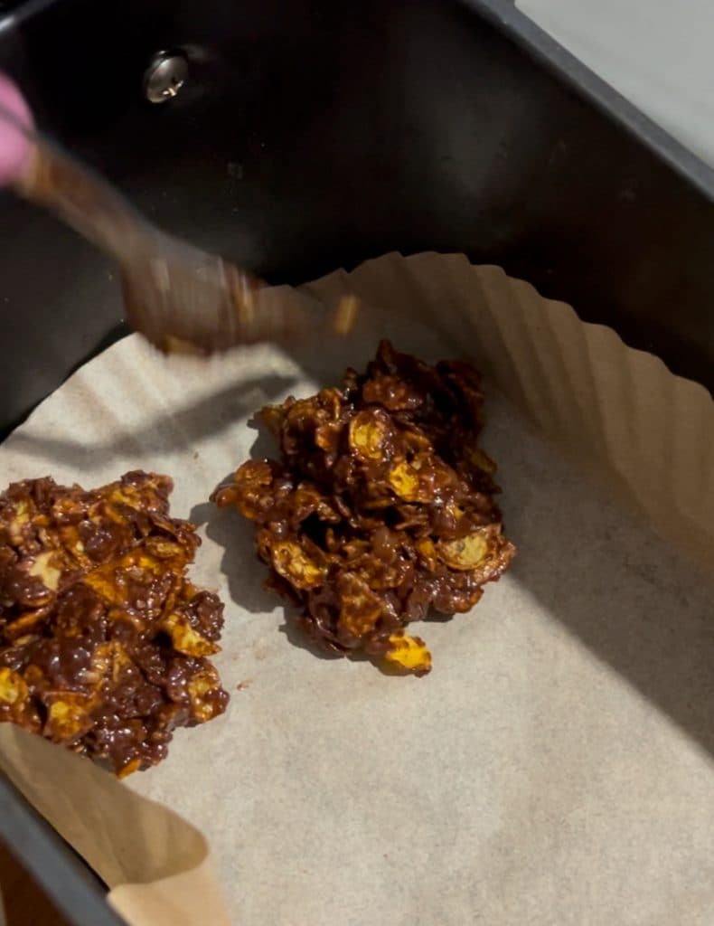 Nehmen Sie nun einen Löffel Teig auf einmal und platzieren ihn im Korb der Heißluftfritteuse, helfen Sie sich dabei mit einer Gabel, um ihn herunterzulassen und kleine Häufchen zu formen. Backen Sie bei 160°C für etwa 15 Minuten, bis der Snack außen knusprig und bereit zum Genießen ist.