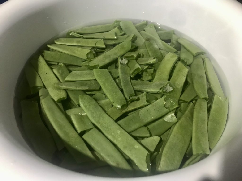Der erste Schritt ist das Reinigen der flachen Bohnen, indem Sie mit den Händen die Enden entfernen und sie mit den Fingern in zwei bis drei Stücke brechen. Legen Sie sie in Wasser, um sie gründlich zu waschen. Spülen Sie sie mehrmals.