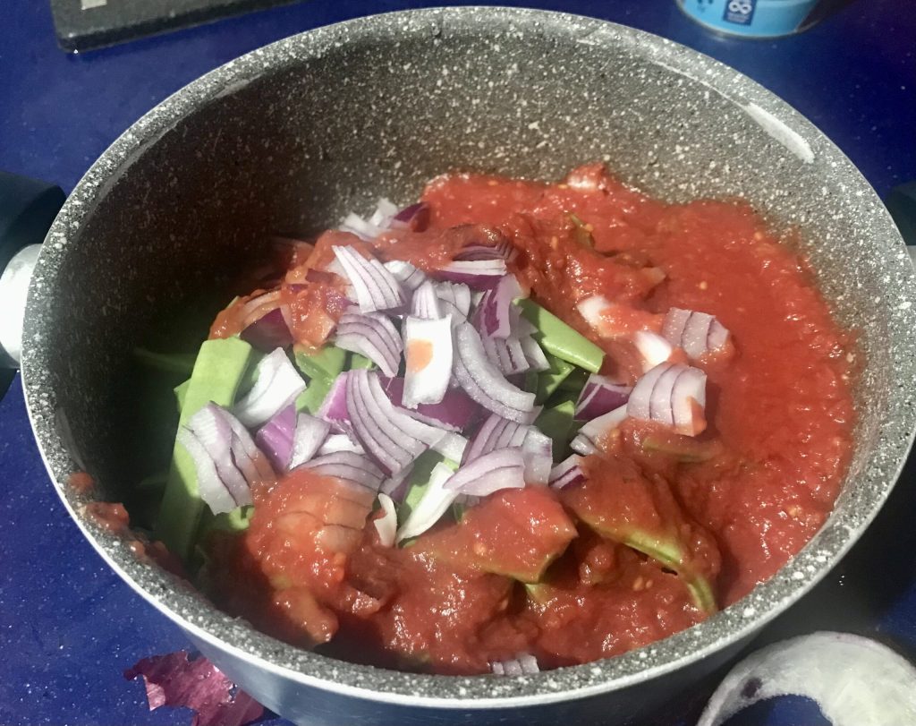 Ich empfehle die Verwendung eines hohen Topfes zum Kochen der breiten grünen Bohnen mit Tomaten.