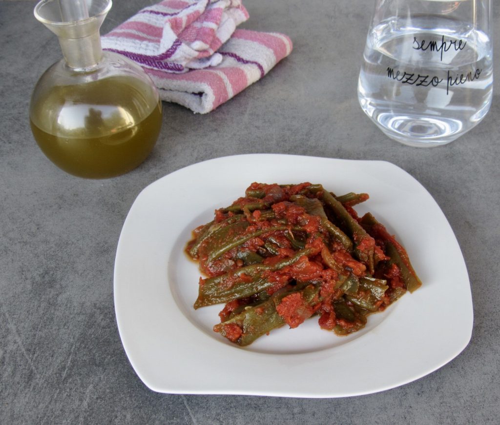Die breiten grünen Bohnen mit Tomaten sind eine leichte Gemüsebeilage und benötigen nicht viel Öl. Um das Ende des Kochens zu erreichen, selbst wenn die Sauce reduziert ist (abhängig von den verwendeten Tomaten), fügen Sie Wasser und nicht mehr Öl hinzu.