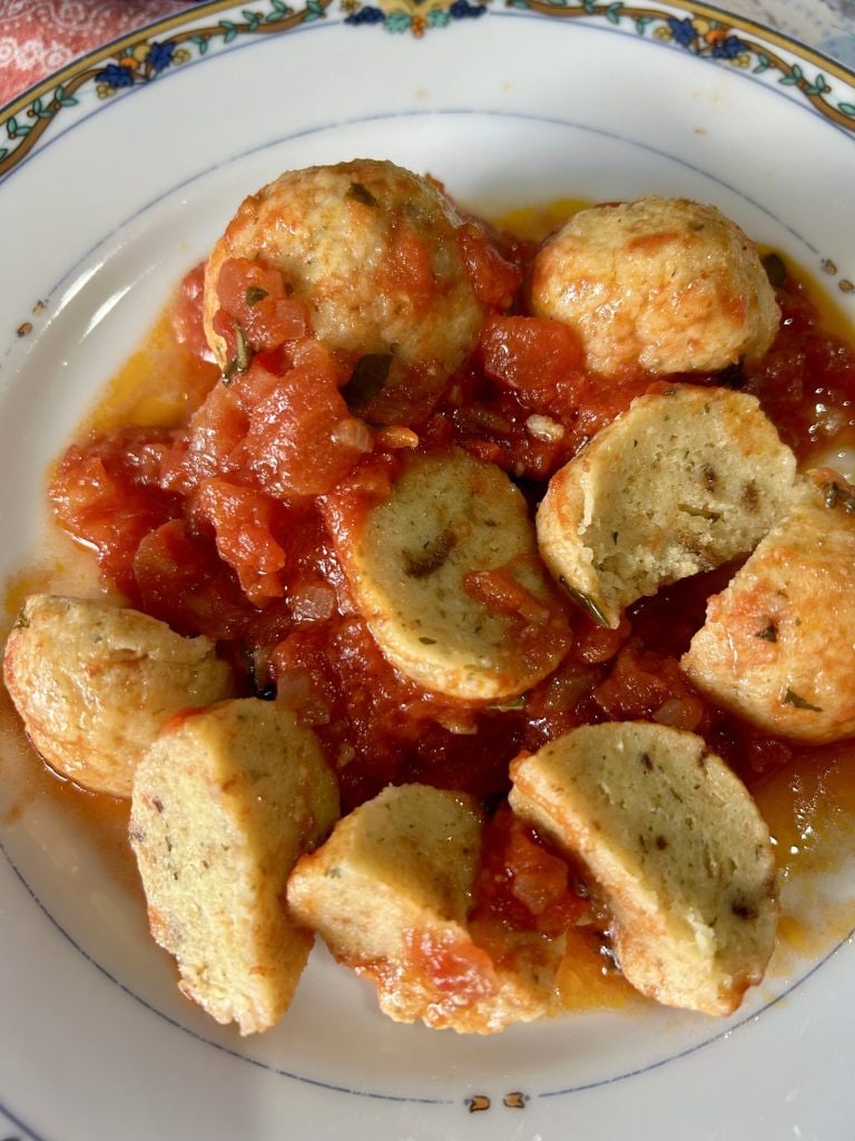 Für die Brotbällchen gibt es viele Rezepte, die von Region zu Region und vor allem von Familie zu Familie unterschiedlich sind. In jedem Fall sind sie weit mehr als nur ein Resteverwertungsgericht. Ich biete Ihnen meine Version an, ohne die Bällchen zu frittieren, bevor Sie sie in die Soße geben.
