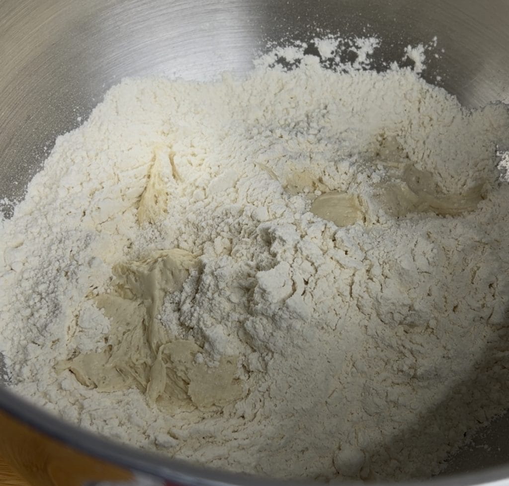 • Geben wir die beiden Mehlsorten, den Zucker und das Salz in die Schüssel der Küchenmaschine und rühren wir sie mit einer Gabel, um die Zutaten gut zu verteilen. Fügen wir den in Stücke gebrochenen Sauerteig direkt in die Schüssel und starten die Küchenmaschine auf mittlerer bis niedriger Geschwindigkeit.
